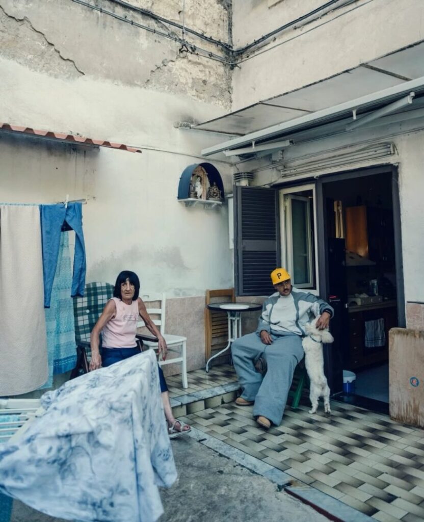 La copertina del progetto dice tanto quanto il titolo. La cover ritrae l’interno di una tradizionale casa meridionale, in un momento di vita quotidiana. C’è una tavola apparecchiata, tovaglia, bottiglia, una famiglia trascorre con tranquillità gli istanti subito dopo il pranzo. Un uomo apre il frigo sullo sfondo; una ragazza, seduta sulla sedia, sorride con le gambe tra le mani; un bambino corre in primo piano. Tutto indossano abiti da casa, canottiere, vesti semplici. Sembra che la fotocamera si sia intrufolata in una casa qualsiasi, di un rione qualsiasi, per spiare il più ordinario dei momenti quotidiani.